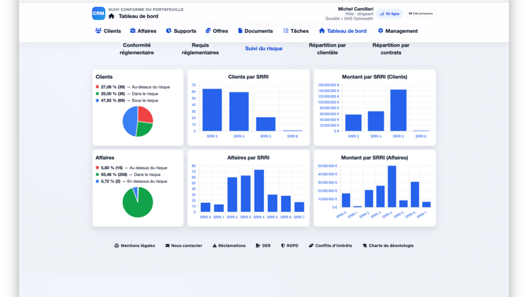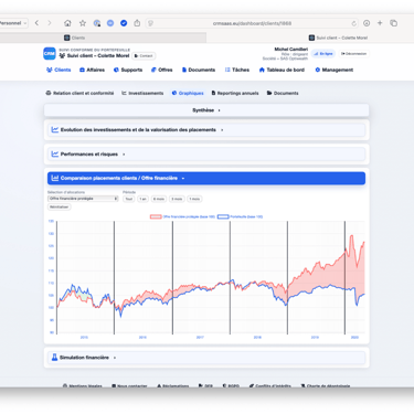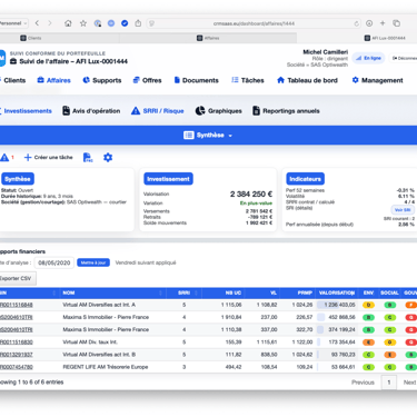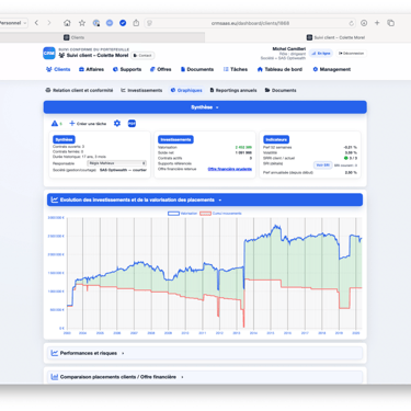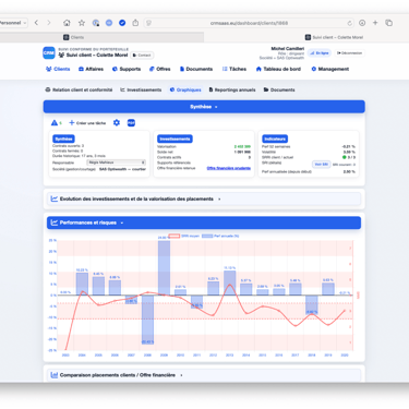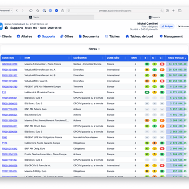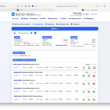 Le client est vu de façon consolidée, le performances et risques sont calculés via un "look-through", c'est à dire une consolidation réelle de tous les sous-jacents de tous ses placements (et non une moyenne comme l'indique trop d'outils non conformes)... Les calculs de risques via le SRI sont fait aux niveaux du clients, mais aussi au niveau du contrats.