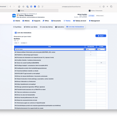 Création automatique de tâches, ajout dans votre agenda, envois de mails, gestion du livre des réclamation (norme ACPR), ...