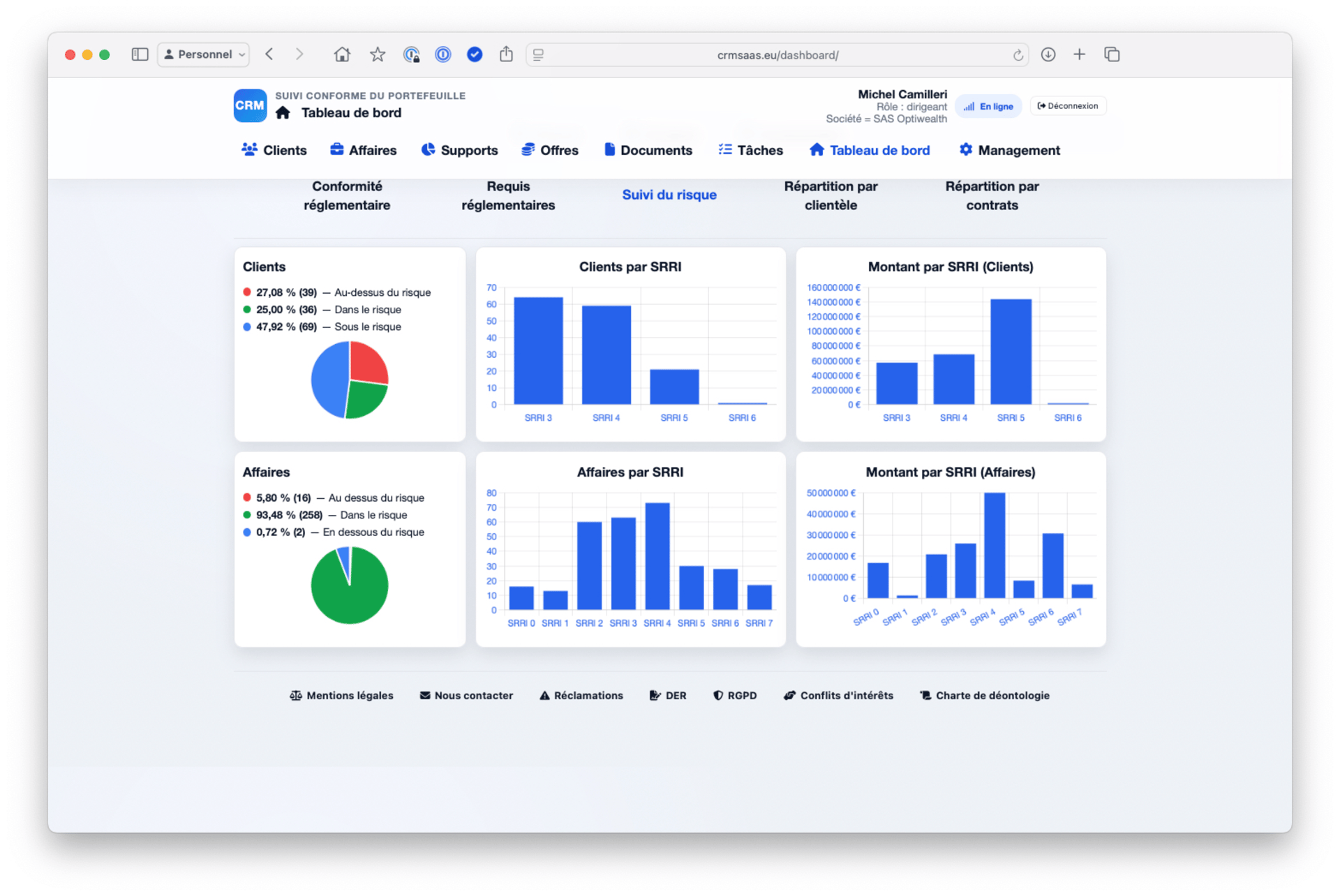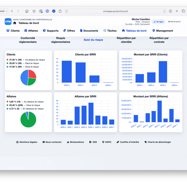Le client est vu de façon consolidée, le performances et risques sont calculés via un "look-through", c'est à dire une consolidation réelle de tous les sous-jacents de tous ses placements (et non une moyenne comme l'indique trop d'outils non conformes)... Les calculs de risques via le SRI sont fait aux niveaux du clients, mais aussi au niveau du contrats.